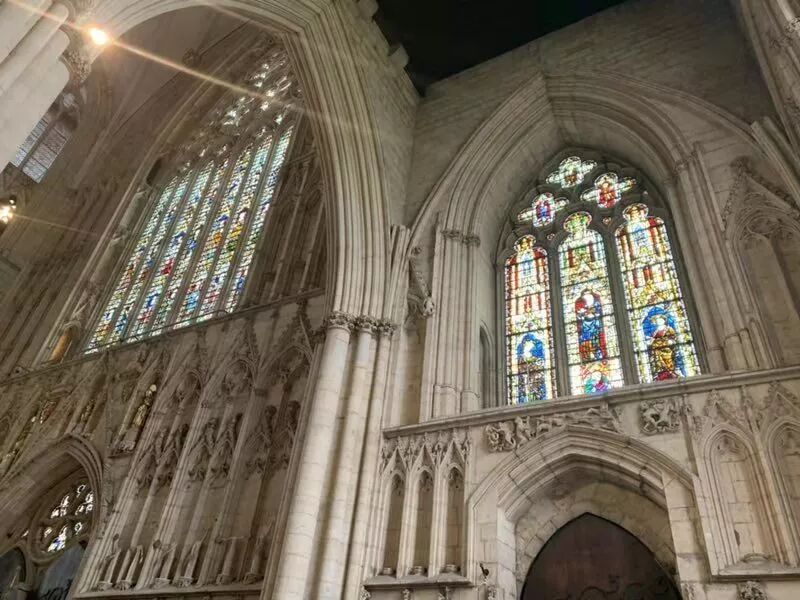 约克大教堂是欧洲目前最大的中世纪哥特式教堂(不是最大的教堂,最大的教堂是西班牙巴塞罗那的圣家堂),教堂于1220年开始兴建,250年后完工,教堂外观非常的雄伟威严。另外,其拥有目前世界上最大面积的彩绘玻璃窗和英国最大面积的灰色单调色玻璃窗。登上70多米高的中央塔楼,可以将古朴的约克城及不远处的田园风光尽收眼底。大教堂会定期举办唱诗班表演,坐在礼拜堂内聆听,宛如天堂。
