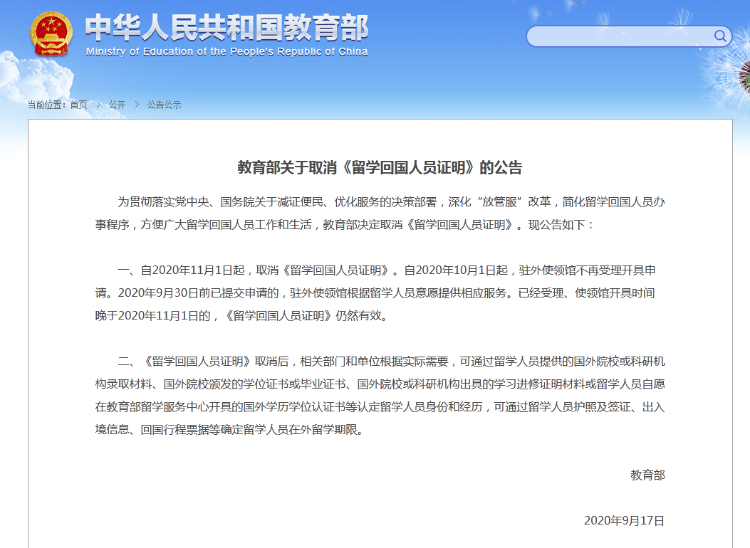 2020年9月30日前已提交申请的,驻外使领馆根据留学人员意愿提供相应服务。已经受理、使领馆开具时间晚于2020年11月1日的,《留学回国人员证明》仍然有效。