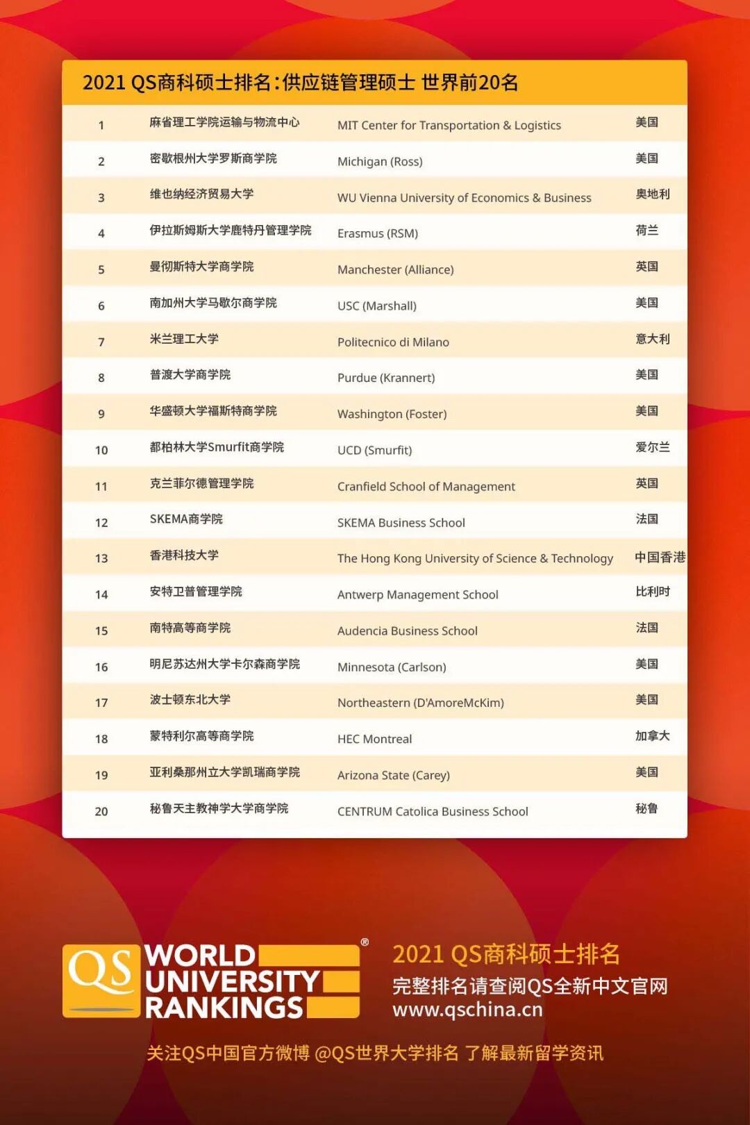 在商业硕士排名中,目前最受全球雇主欢迎的五大商科硕士项目均已囊括其中,包括:商业分析硕士、金融硕士、管理学硕士、市场营销硕士、供应链管理硕士。值得一提的是,供应链管理硕士专业在今年首次参与QS商科硕士排名。