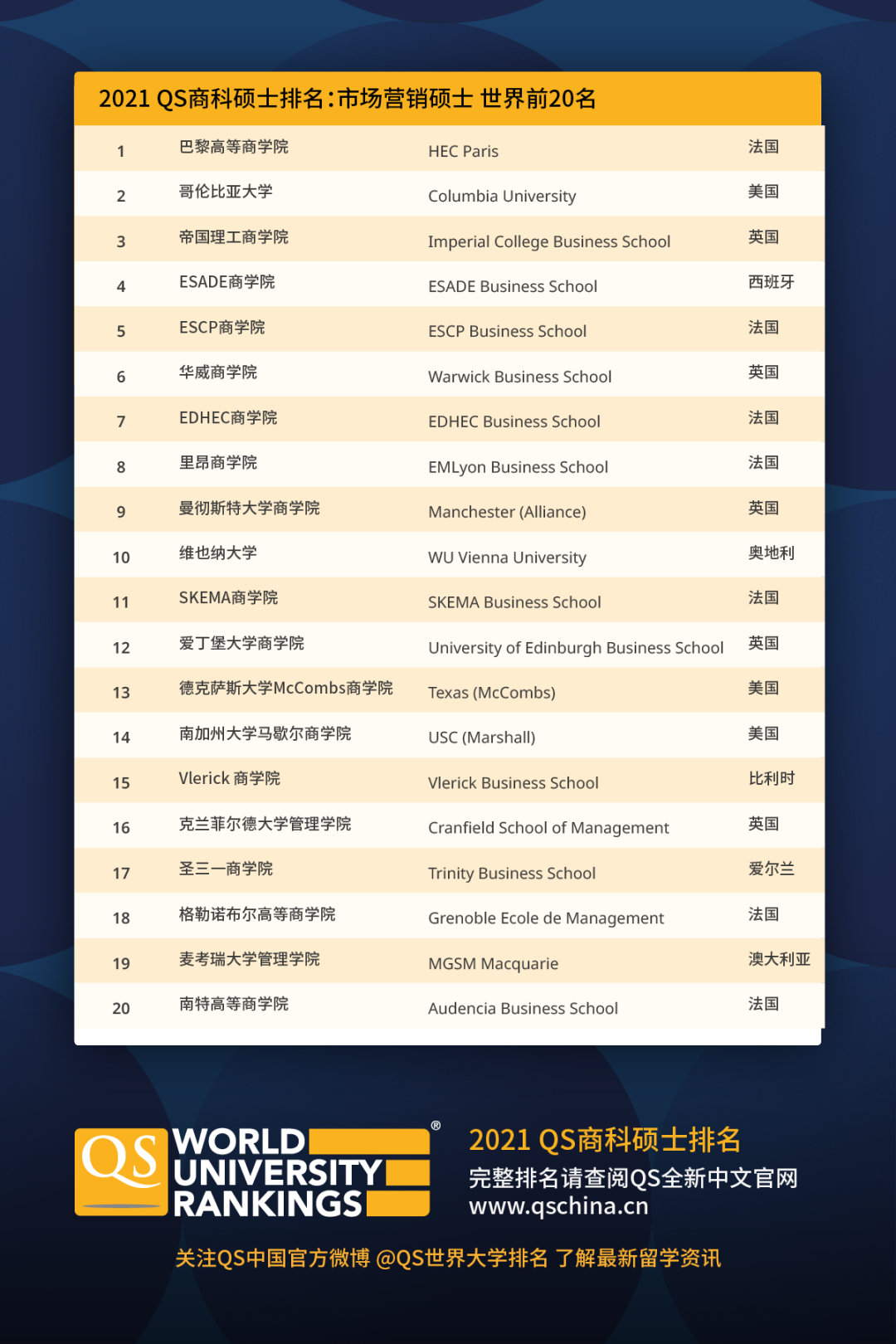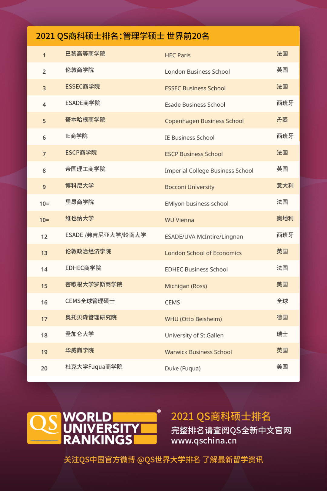 2020年9月23日,全球高等教育研究机构QS(Quacquarelli Symonds)发布了最新的2021商科硕士排名!另外,QS还一同发布了全日制MBA(工商管理硕士)项目的最新全球排名。
