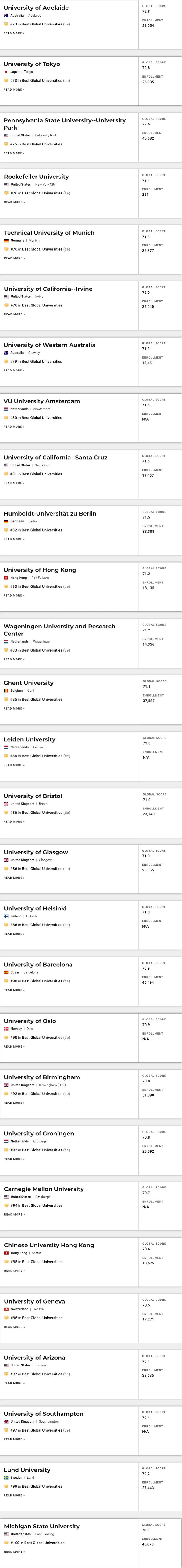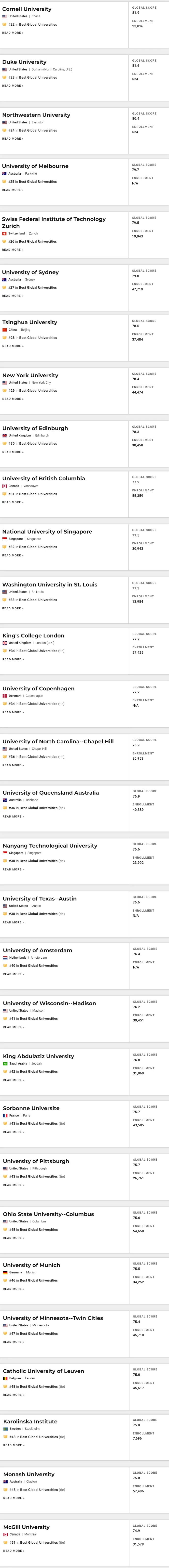 21.加州大学圣地亚哥分校(UCSD)、 22.康奈尔大学、 23.杜克大学、 24.西北大学 、25.墨尔本大学