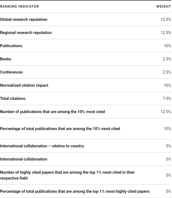 全球研究声誉12.5%,地区性研究声誉 12.5%,发表论文10%,出版书籍2.5%,学术会议2.5%,标准化引用影响10%,总被引用次数7.5%,高频被引文献数量(在引用最多文献的前10%) 12.5%,高频被引文献百分比(在引用最多文献的前10%)10%,国际合作10%,高频被引文献数量(在各自领域被引次数最多的前1%)5%和高频被引文献百分比(在各自领域被引次数最多的前1%)5%。