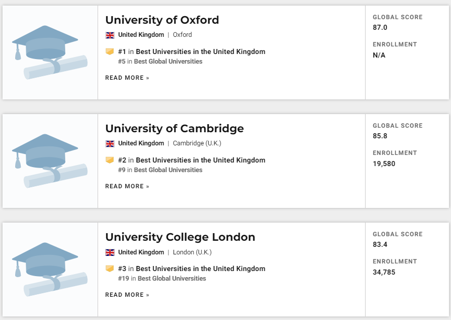 牛津大学依旧全球第五;剑桥大学依旧全球第九;帝国理工依旧全球第20名;好消息来自UCL,上升2名位列全球第19,反超帝国理工。