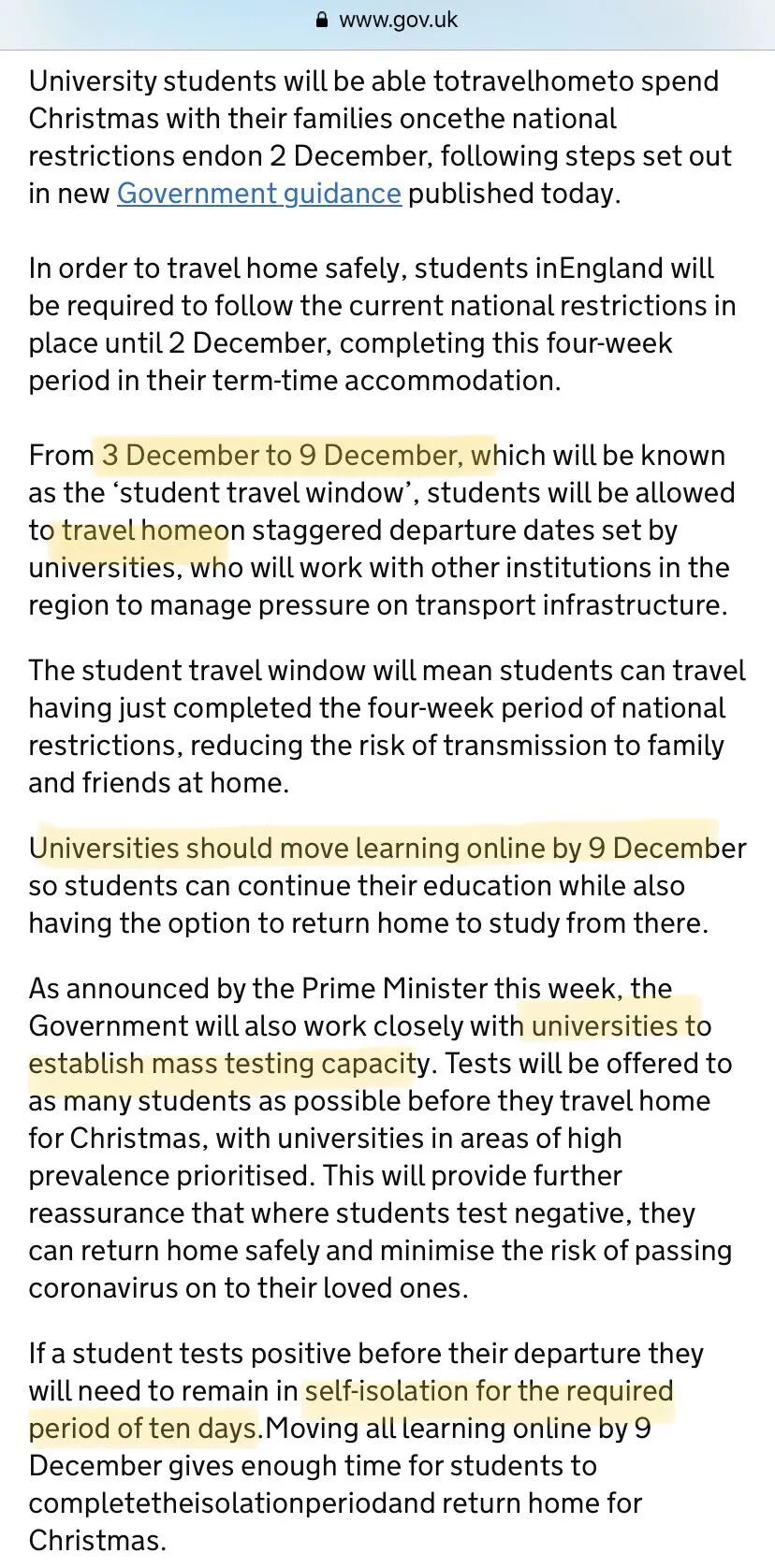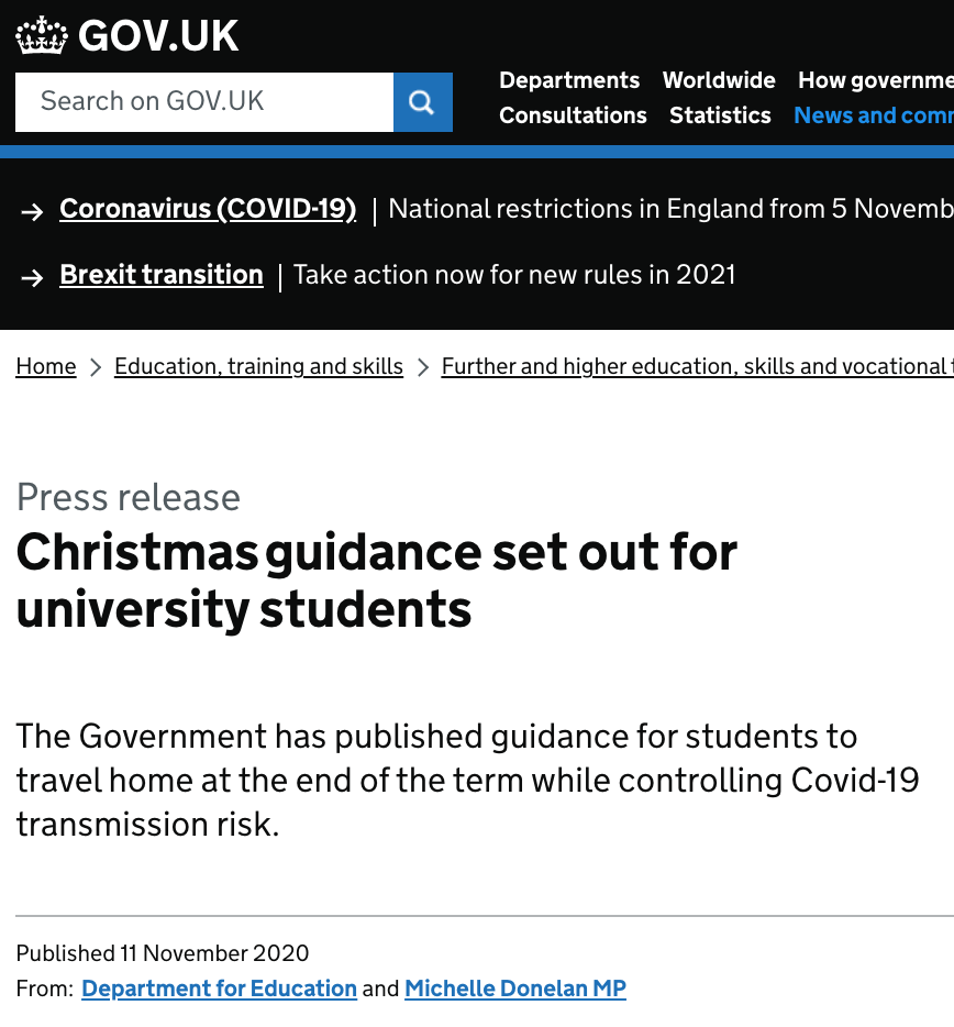英国时间11月11日,英国政府发布了有关大学学生在12月圣诞假期期间的指南!