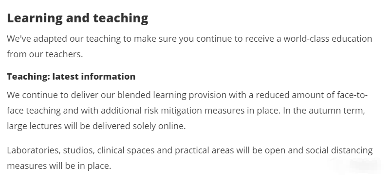 不过在这之前,就已经有很多英国大学早就已经让学生自主选择,第一学期的剩余时间是否要上网课了。甚至还可以提前申请明年1月是否上网课。以下是在这之前通知可以上网课的学校汇总。