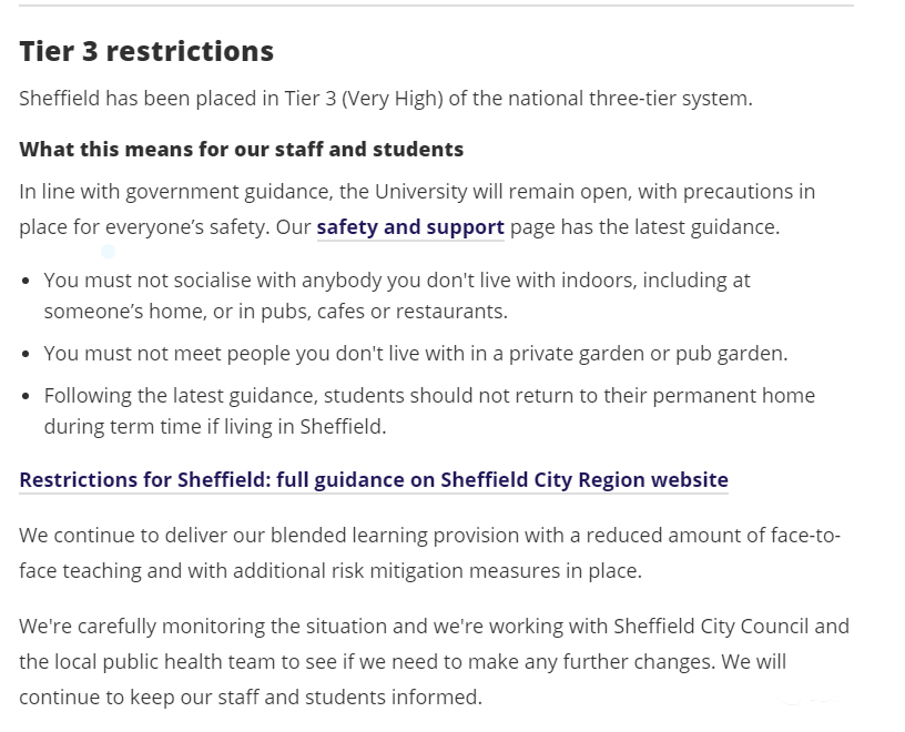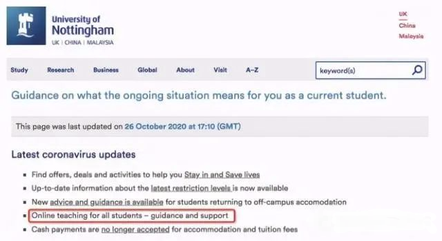根据官网10月26日更新的信息,诺丁汉大学表示将为所有学生提供在线教学,面对面授课仅会在安全的情况下进行,并将减少小组人数和上课时间。