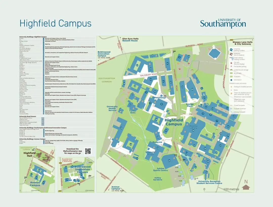 南安普顿大学共有七个校区,四个校区位于南安普顿,一个位于温彻斯特,另一个正在重建(波得伍德校区),最后一个为海外的马来西亚分校。其中海菲尔德校区(Highfield)作为主校区,附近拥有各式体育运动设施建筑与住宿空间,也是南安普顿大学同学最常驻足的校区,城市内uni-link巴士连接着市内四个校区及市中心的商场与火车站。温彻斯特艺术学院也是南安普顿最后欢迎的时尚管理与纺织品设计所在校区。七个校区中坐落在英格兰南海岸的南安普顿校区和温斯切特校区,风景宜人,安谧舒适。且交通便利,校区内有连接巴士,距离车站飞机场很近,便于学生的外出交流。