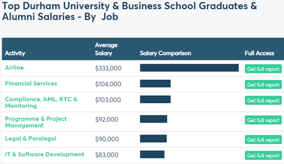 根据emolument调查显示,杜伦大学校友及毕业生的年薪最高的是航空业专业人士,为33.3万美元。