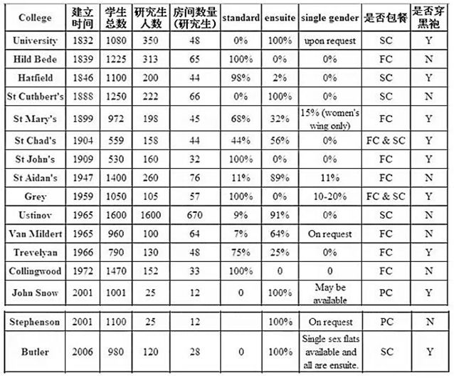 附:16个学院的概况 *FC指包餐,SC指不包餐,PC指每周两餐 黑袍是在参加各种典礼和formal的时候必须穿的, Y代表是,N代表否,即不要求黑袍,也没场合穿黑袍。