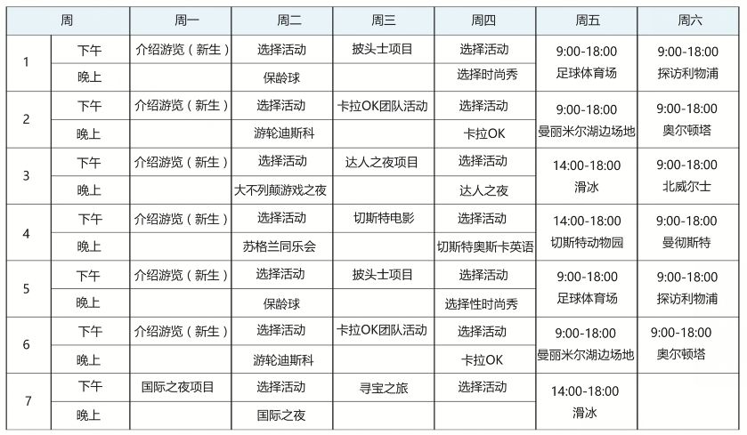 *(此表为下午晚上社交项目活动表,不包上午含英语学习课程表)