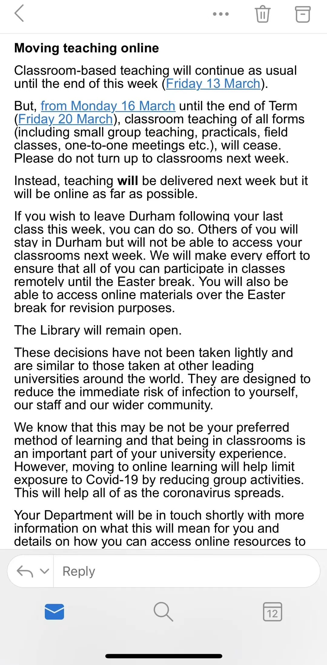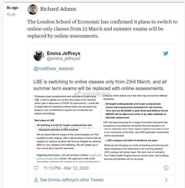比如杜伦大学,已经给学生们发了邮件,改为线上教学。