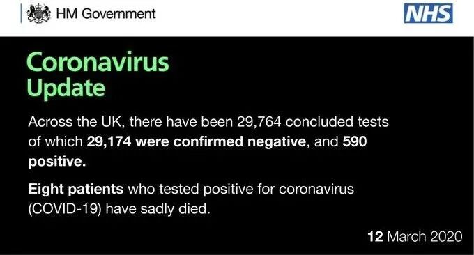 截至当地时间3月12日上午9:00,英国的总确诊病例数增至590例。自昨日公布数据以来,暴增134例,共8例死亡(公布后很快又增加2例,共10例死亡)。