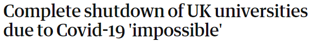 昨日,英国卫报的大标题说:英国大学“不可能”因新冠肺炎完全关闭。