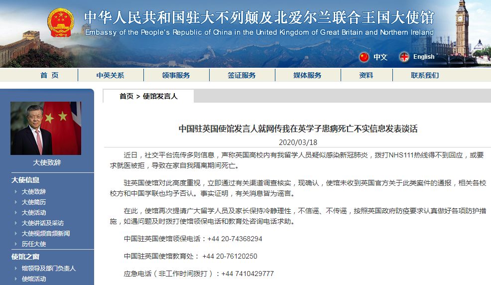近日,社交平台流传多则信息,声称英国高校内有我留学人员疑似感染新冠肺炎,拨打NHS111热线得不到回应,或要求就医被拒,导致在家自我隔离期间死亡。 驻英国使馆对此高度重视,立即通过有关渠道调查核实,现确认,使馆未收到英国官方关于此类案件的通报,相关各校校方和中国学联也均予否认。事实证明,有关消息皆为谣言。 在此,使馆再次提请广大留学人员及家长保持冷静理性,不信谣、不传谣,按照英国政府防疫要求认真做好各项防护措施,如遇问题及时拨打使馆领保电话和教育处咨询电话求助。 中国驻英国使馆领保电话:+44 20-74368294 中国驻英国使馆教育处:+44 20-76120250 应急电话(非工作时间拨打):+44 7410429777
