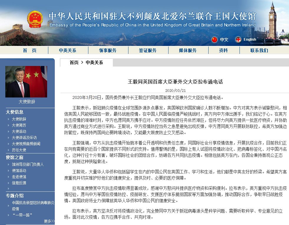 3月20日,中国国务委员兼外长王毅应约同英国首席大臣兼外交大臣拉布通电话,表达中国愿意为英国提供帮助,并提供医疗物资。