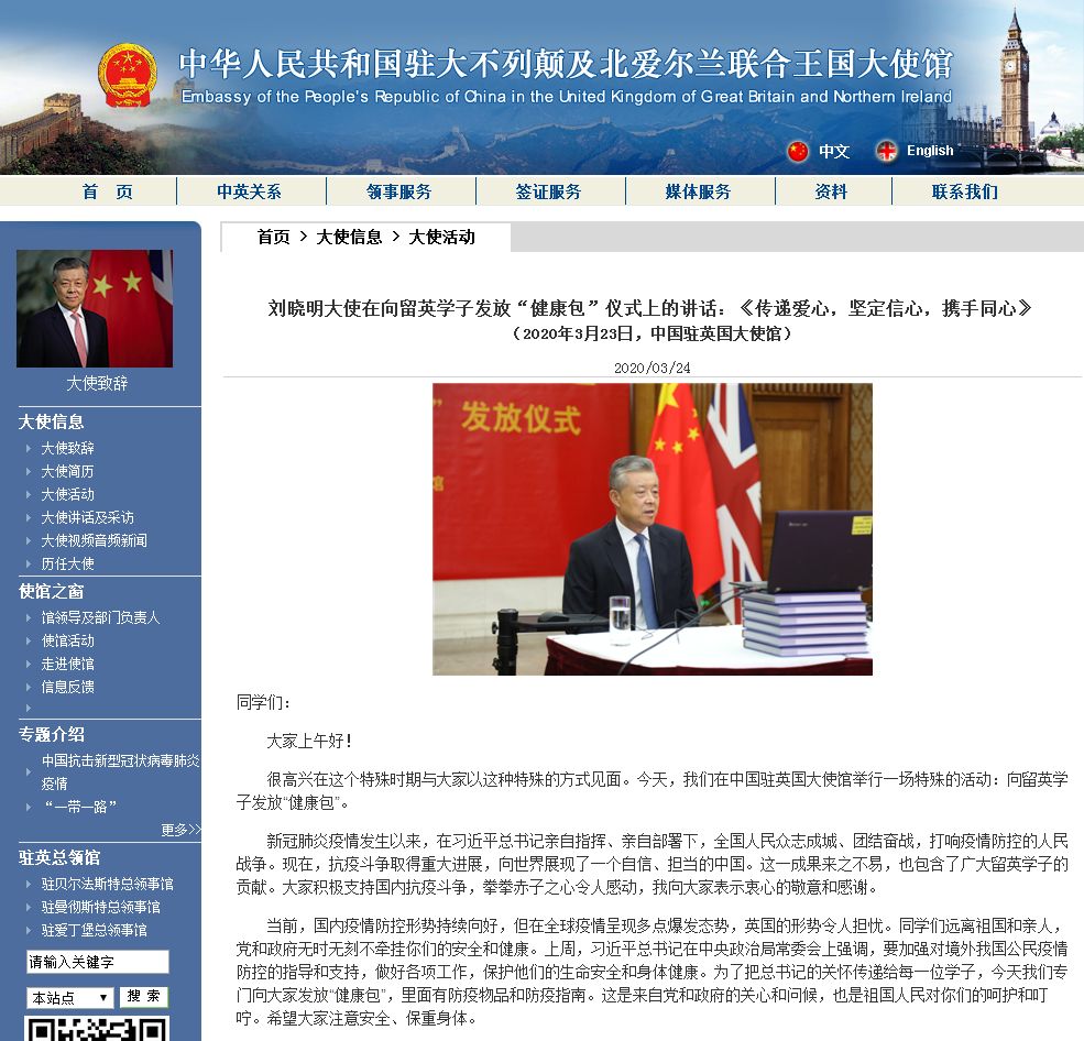 3月23日,中国驻英大使刘晓明在向留英学子发放“健康包”仪式上的讲话:《传递爱心,坚定信心,携手同心》