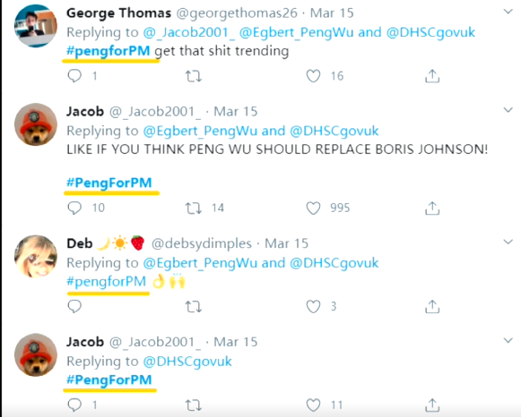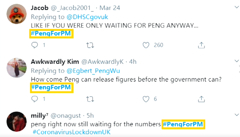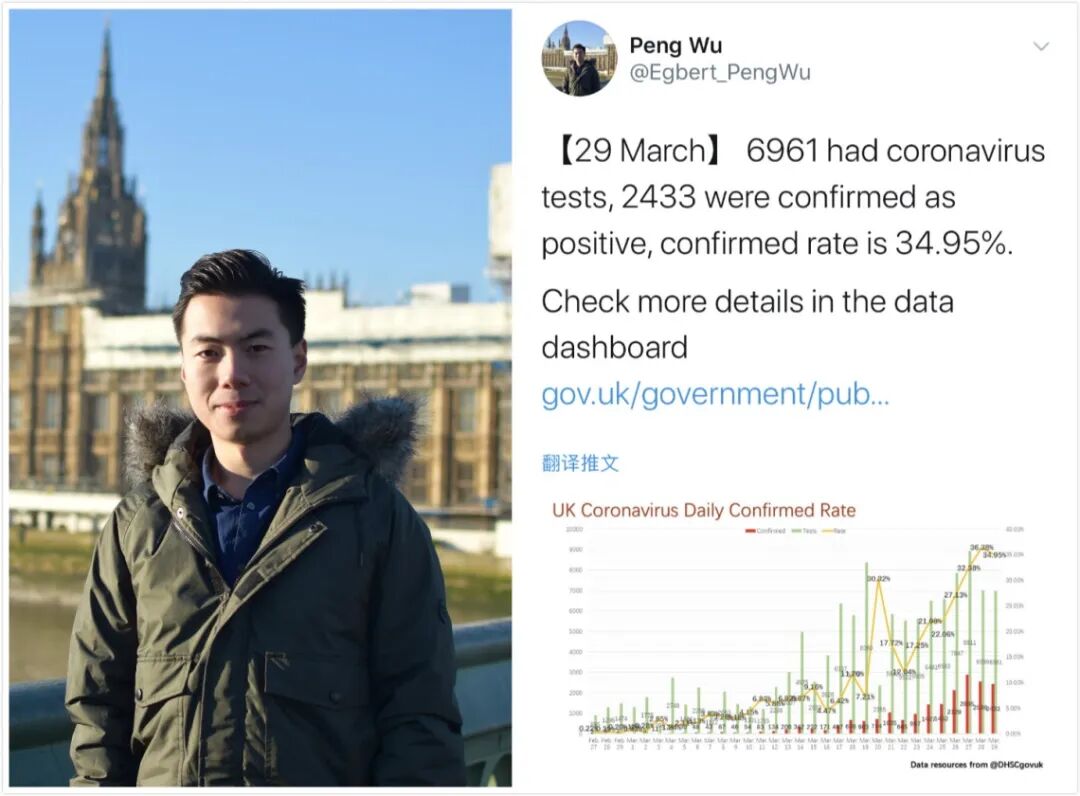 就是这位26岁的英国利兹大学中国留学生吴芃(péng)!他的推特受到英国卫生部门和众多民众的关注和称赞,英国下议院议员、地方议会议长等都被他“圈粉”,还有网友开玩笑喊他“当首相”,发起“PengForPM(吴芃当首相)”话题,每天催他更新。