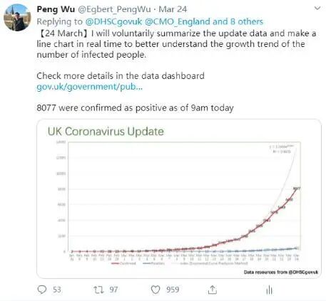“3月22日下午,英国卫生部一个工作人员给我打电话了。他首先比较客气地表达了感谢,然后说,因为他们每天只能发布一条信息,所以无法发布绘制的图表,现在他们也更新了一个网站,有发布折线图的图表,但是因为工作繁忙不能及时更新,所以发布时间往往非常滞后。他们感谢我能够在他们的推特下马上生成这样的数据图。”