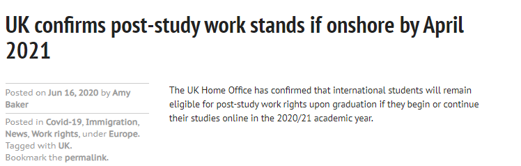 疫情影响,语言考试频频生变与签证中心的关闭影响了全球范围内的留学生的学习计划,6月正是国际生做决定的关键时期,此刻PSW的利好消息尘埃落定,无疑给英国留学生增加了信心。