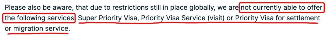 但由于全球范围内仍然存在限制,签证中心暂时无法提供以下服务:超级优先签证服务、优先签证服务(访问)、用于定居或移民的优先签证服务。