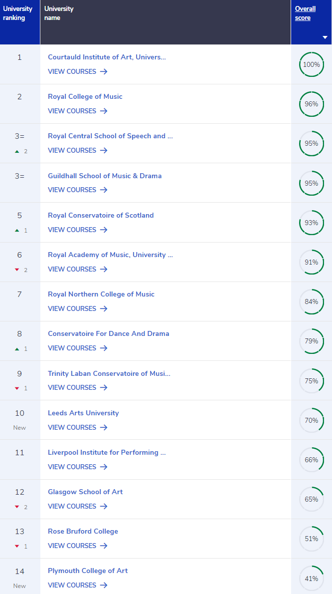 由于部分艺术、戏剧、音乐类学校(Arts, Drama & Music)没有被大学综合榜单收录。CUG为未上综合榜的14所艺术、戏剧、音乐类大学单列了一个榜单,如下: