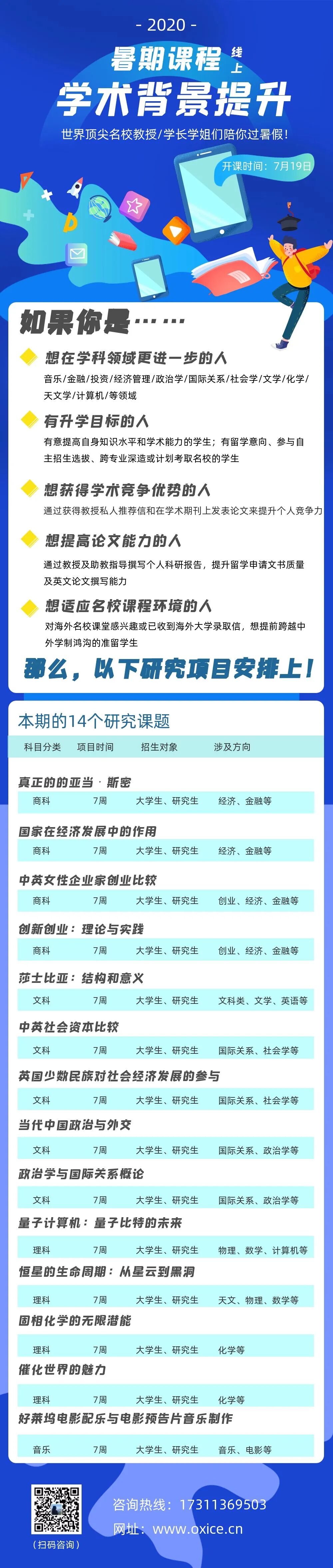 这次的项目涵盖了音乐/金融/投资/经济管理/政治学/国际关系/社会学/文学/化学/天文/物理/数学/计算机等领域,如果你是商科/理科/文科/音乐生,那么恭喜你赚到啦,赶快扫描下方的二维码详细了解吧!