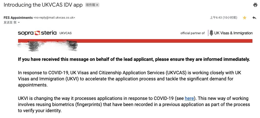在UKVI通知申请人符合条件后的几周,就会给申请人发详细的APP使用指南邮件,指导大家下一步要干什么。该邮件将会介绍最新的IDV App用途是什么,并且告诉申请者之前提供的指纹可以重复使用,不再需要预约亲自去签证中心面签。