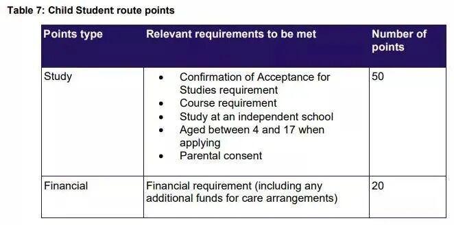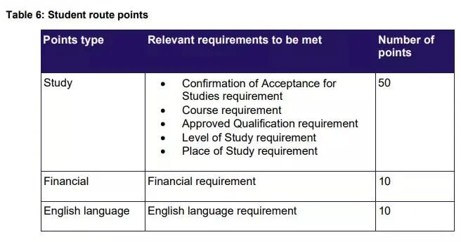 学生签证申请人需满70分,符合下表要求可获得相应积分。