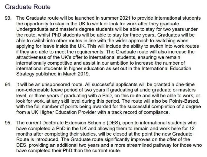 除了以上改变,英国政府还在发布的官宣中特别强调将于2021年夏天正式复活PSW签证,允许来英国际留学生毕业后留英两年,博士生可留英三年。